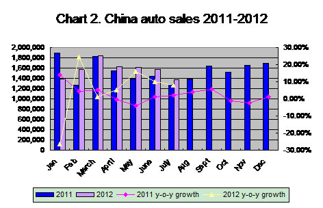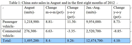 China’s auto sales amounted to 1,495,200 units in August 2012, year-on-year up 8.26 percent compared to the same period of 2011, according to statistics released by the China Association of Automobile Manufacturers (CAAM).
