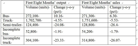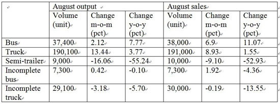 China’s output and sales of semi-trailer and incomplete truck continued the downward trend in August, but others showed slightly increase in August.