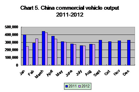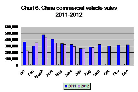 The following table showsChina’s output and sales of sub-type commercial vehicles in August 2012, based on the CAAM data: