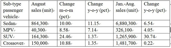 The following table shows the sales of major sub-type passenger vehicles in August and in the first eight months of 2012: