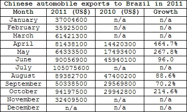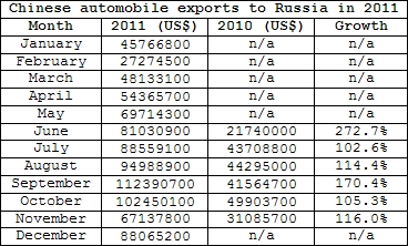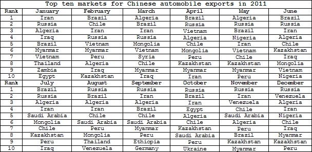 According to reports, the largest markets for Chinese automobile exports in 2010 included Algeria, Iran, Vietnam, Chile, Syria and Peru. The following year, Russia, Chile, Brazil, Myanmar and Kazakhstan were added to that list. In particular, exports destined for Russia and Brazil grew incredibly from 2010 to 2011.