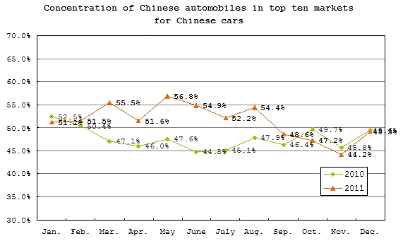 According to statistics recently compiled by Gasgoo.com (Chinese), the concentration of Chinese vehicles in the country's top ten export markets has been fluctuating around the 50 percent mark for the last two years. As seen in the below graph, the average monthly concentration has grown from sub-50 percent in 2010 to over 50 percent last year.