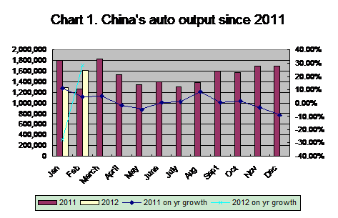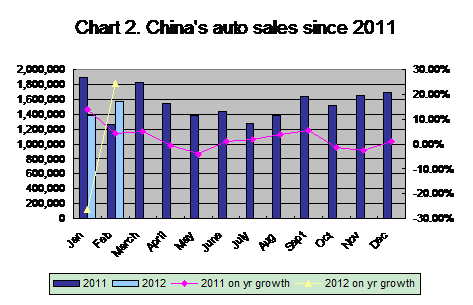 The following table specifies China’s auto sales in February and the first two months of 2012, based on the CAAM data: