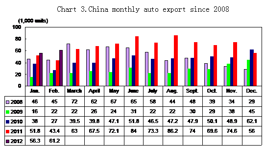 The country’s monthly auto exports reached 61,200 units in February, up 8.7 percent from January 2012 and 41.1 percent from February 2011.