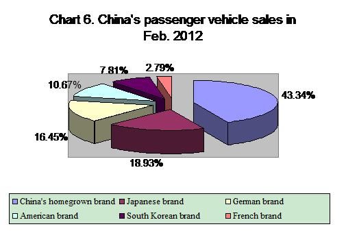 The monthly homebred passenger vehicle sales accounted for 43.34 percent of the total passenger vehicle sales in China, up 1.26 percentage points from January 2012 but down 3.43 percentage points from February 2011.