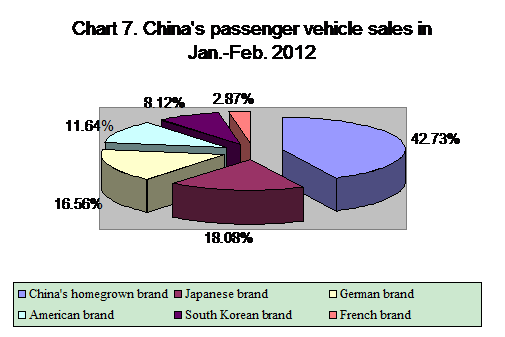 Sales of Japanese, German, American, South Korean, and French-brand passenger vehicles stood at 429,200, 393,000, 276,300, 192,800, and 68,200 units respectively in the January-February period, as is shown in Chart 7: