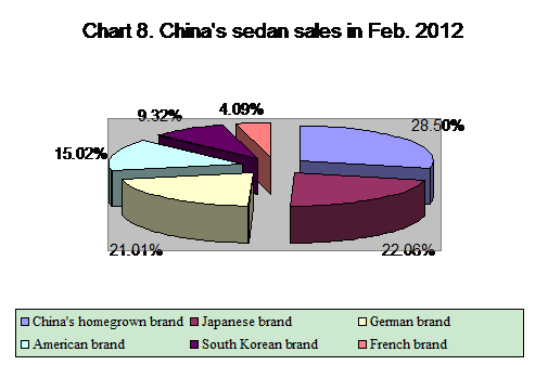 Homegrown brand sedan sales gained 8.81 percent month on month and 20.60 percent year on year to 236,000 units in February, taking up 28.50 percent of total sedan sales, up 1.30 percentage points from January 2012 but down 2.43 percentage points from February 2012.