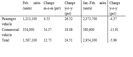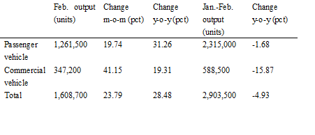 The monthly auto output and sales in February reached 1.61 million units and 1.57 million units respectively, up 28.48 percent and 24.51 percent year on year.
