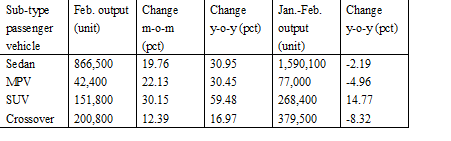 The following is a table showing the output of major sub-type passenger vehicles in February and in the first two months of 2012: