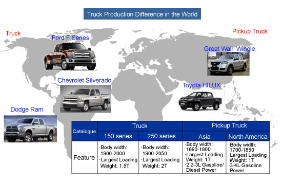 Due to culture difference in Eastern and Western Society, there are different production demand in different areas. In North America, trucks (large-size) are popularized because of its wide body, high chassis and strong power; In China andSoutheast Asia, pickup trucks (light-size) are more favorite by its compact body and saving energy.