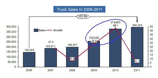 Nowadays, there are about 4.1 million trucks sold in the world every year. Amongst, there are over 1.6 million trucks sold inAmericain 2010, which takes 40% of global sales; about 380,000 trucks sold inChina, taking 9% of total sales.