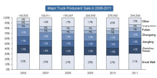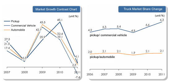 At present, pickup takes small proportion in commercial vehicle market, but growth of pickup sales is much higher than of commercial vehicle sales. In 2011, pickup’s share in commercial vehicle market increased to 6.3% from2009’s 4.9%.