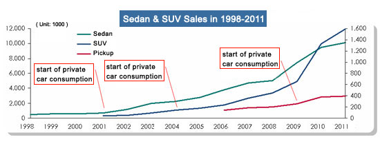 InChina, pickup truck is managed and taxed as van, which limits pickup trucks' development. However, thanks toChina's auto subsidiary policy, sales of pickup trucks rapidly grew to 394,000 vehicles in 2011.
