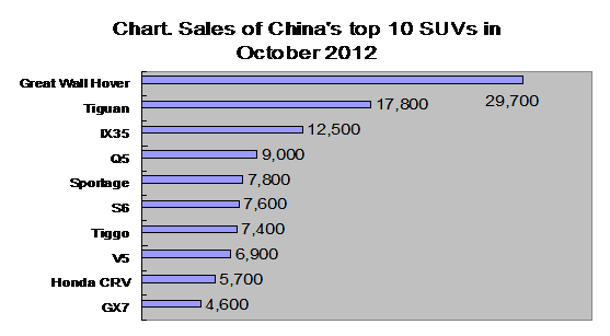 Great Wall Hover advanced to be the most popular SUV brand in October, with the monthly sales hitting 29,700 units in October, statistics from the China Association of Automobile Manufacturers (CAAM) show.