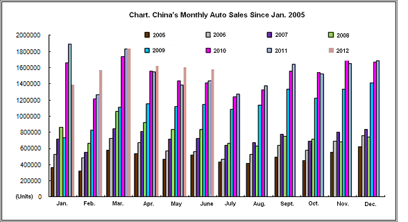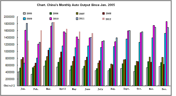 Specifically, passenger vehicle output surged 7.05% year on year to 6.34 million units, while sales of passenger vehicles gained 5.48% year on year to 6.33 million units in the first six months of 2012.